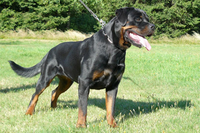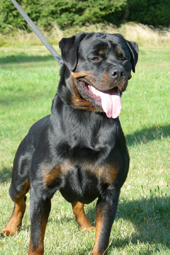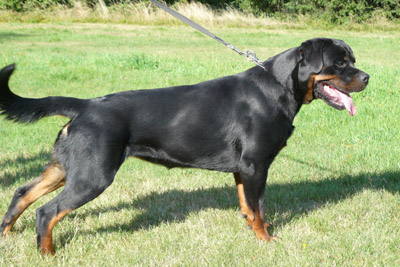 A calm and friendly bitch, strong bones and muscles, strong head, eyes 2a. open lid, small cheekbone, distinct stop und broad muzzle, dark nose, inner flews and maul angle patchy, dental lamina rose, a little bit open flews, correct ears, strong neck, slack neck skin, normal chest, solid shoulders, forehand straight, soft bound, soft back line, correct hair, redbrown and a bit sooted signs, free and wide moving.